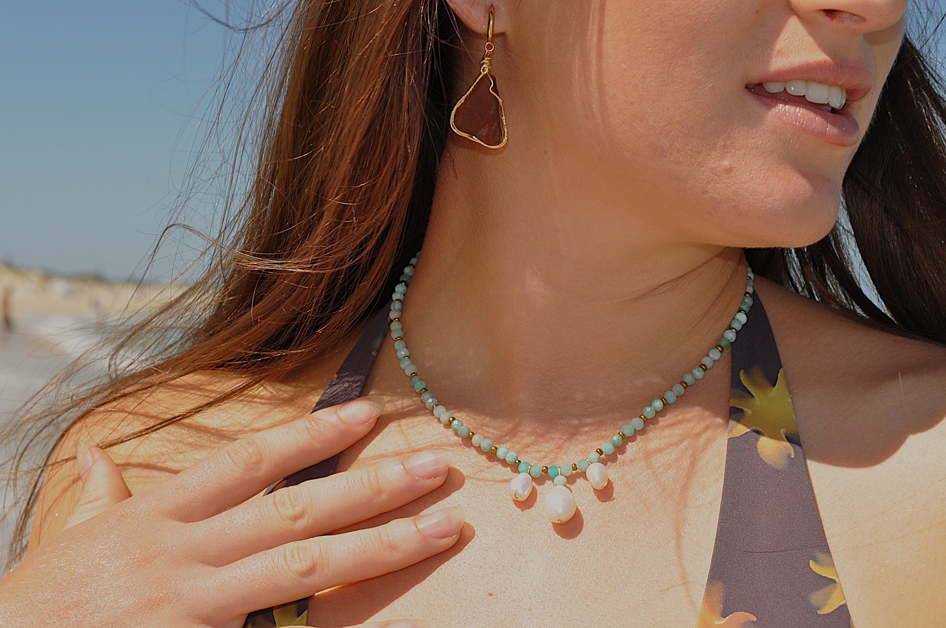 A soft blend of natural amazonite and luminous freshwater pearls, finished with gold-filled details for a warm, sunlit glow. The calming sea toned greens meet classic pearl for a piece that feels both effortless and elevated.