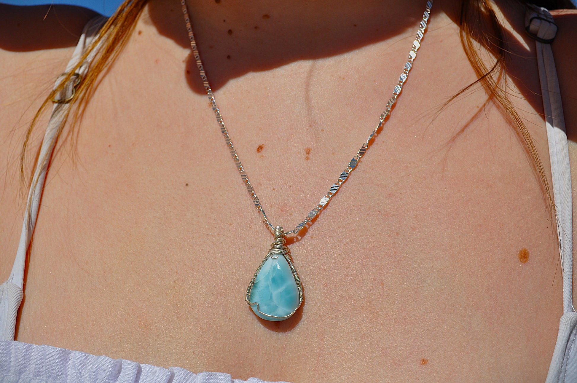 Inspired by the salt warmed skin and the shine of the ocean at sunset, the salty sea necklace is handcrafted in 925 sterling silver. This wire wrapped pendant features a stunning Larimar stone as the centrepiece. A reclaimed vintage sterling silver chain, reimagined with a hand wire-wrapped natural stone. One of one. No restocks.